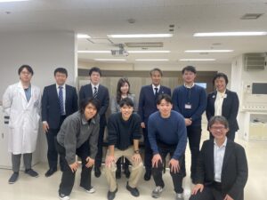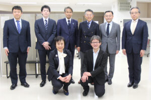 後列左から、丸山補佐、秋葉補佐、井上審議官、張替病院長、石井研究科長、亀井副病院長、前列左から向井特別補佐、中川産学連携室長